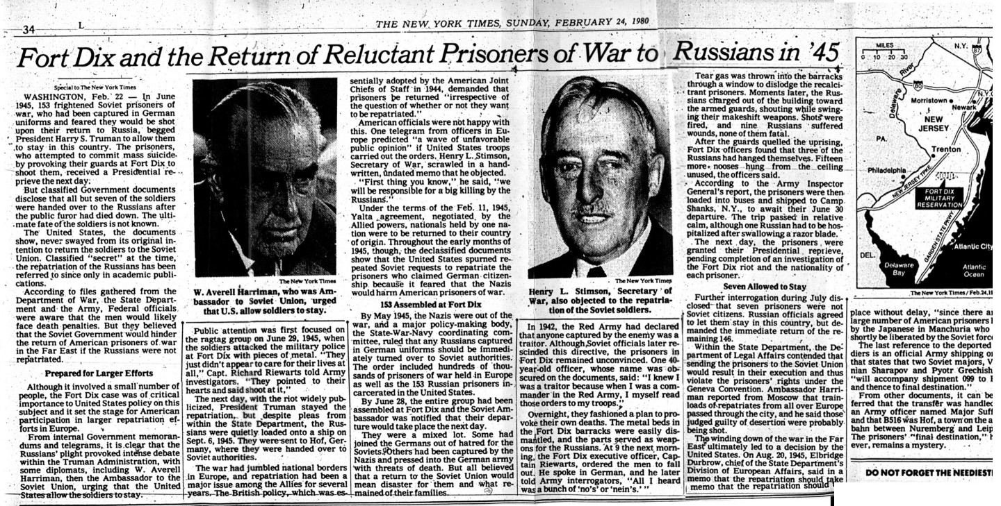 Historic Newpaper ArticlesNew York Times, November 24, 1980Fort Dix and the Return of Reluctant Prisoners of War to Russians in '45WASHINGTON, Feb. 22 - In June 1945, 153 frightened Soviet prisoners of war, who had been captured in German uniforms and feared they would be shot upon their return to Russia, begged President Harry S. Truman to allow them to stay in this country. The prisoners, who attempted to commit mass suicide by provoking their guards at Fort Dix to shoot them, received a Presidential reprieve the next day.But classified Government documents disclose that all but seven of the soldiers were handed over to the Russians after the public furor had died down. The ultimate fate of the soldiers is not known. The United States, the documents show, never swayed from its original intention to return the soldiers to the Soviet Union. Classified "secret" at the time, the repatriation of the Russians has been referred to since only in academic publications. According to files gathered from the Department of War, the State Department and the Army, Federal officials, were aware that the men would likely face death penalties. But they believed that the Soviet Government would hinder the return of American prisoners of war in the Far East if the Russians were not repatriated. Prepared for Larger EffortsAlthough it involved a small number of people, the Fort Dix case was of critical importance to United States policy on this subject and it set the stage for American participation in larger repatriation efforts in Europe. From internal Government memorandums and telegrams, it is clear that the Russians' plight provoked intense debate within the Truman Administration, with some diplomats, including W. Averell Harriman, then the Ambassador to the Soviet Union, urging that the United States allow the soldiers to stay. Public attention was first focused on the ragtag group on June 29, 1945, when the soldiers attacked the military police at Fort Dix with pieces of metal. "They just didn't appear to care for their lives at all," Capt. Richard Riewarts told Army investigators. "They pointed to their hearts and said shoot at it." The next day, with the riot widely publicized, President Truman stayed the repatriation, but, despite pleas from within the State Department, the Russians were quietly loaded onto a ship on Sept. 6, 1945. They were sent to Hof, Germany, where they were handed over to Soviet authorities. The war had jumbled national borders in Europe, and repatriation had been a major issue among the Allies for several years, The British policy which was essentially adopted by the American Joint Chiefs of Staff in 1944, demanded that prisoners be returned "irrespective of the question of whether or not they want to be repatriated." American officials were not happy with this. One telegram from officers in Europe predicted "a wave of unfavorable public opinion" if United States troops carried out the orders, Henry L. Stimson, Secretary of War,' scrawled in a handwritten, undated memo that he objected. "First thing you know," he said, "we will be responsible for a big killing by the Russians." Under the terms of the Feb. 11, 1945, Yalta agreement, negotiated, by the Allied powers, nationals held by one nation were to be returned to their country of origin. Throughout the early months of 1945, though, the declassified documents show that the United States spurned repeated Soviet requests to repatriate the prisoners who claimed German citizenship because it feared that the Nazis would harm American prisoners of war. 153 Assembled at Fort DixBy May 1945, the Nazis were out of the war, and a major policy-making body, the State-War-Navy coordinating committee, ruled that any Russians captured in German uniforms should be immediately turned over to Soviet authorities. The order included hundreds of thousands of prisoners of war held in Europe as well as the 153 Russian prisoners incarcerated in the United States. By June 28, the entire group had been assembled at Fort Dix and the Soviet Ambassador was notified that their departure would take place the next day. They were a mixed lot. Some had joined the Germans out of hatred for the Soviets. Others had been captured by the Nazis and pressed into the German army with threats of death. But all believed that a return to the Soviet Union would mean disaster for them and what remained of their families. In 1942, the Red Army had declared that anyone captured by the enemy was a traitor. Although, Soviet officials later rescinded this directive, the prisoners in Fort Dix remained unconvinced. One 40 year-old officer, whose name was obscured on the documents, said: "I knew I was a traitor because when I was a commander in the Red Army, I myself read those orders to my troops." Overnight, they fashioned a plan to provoke their own deaths. The metal beds in the Fort Dix barracks were easily dismantled, and the parts served as weapons for the Russians. At 9 the next morning, the Fort Dix executive officer, Captain Riewarts, ordered the men to fall out. He spoke in German, and he later told Army interrogators, "All I heard was a bunch of 'no's' or 'nein's'." Tear gas was thrown into the barracks through a window to dislodge the recalcitrant prisoners. Moments later, the Russians charged out of the building toward the armed guards, shouting while swinging their makeshift weapons. Shots were fired, and nine Russians suffered wounds, none of them fatal. After the guards quelled the uprising, Fort Dix officers found that three of the Russians had hanged themselves. Fifteen more nooses hung from the ceiling unused, the officers said. According to the Army Inspector General's report, the prisoners were then loaded into buses and shipped to Camp Shanks, N.Y., to await their June 30 departure. The trip passed in relative calm, although one Russian had to be hospitalized after swallowing a razor blade. The next day, the prisoners, were granted their Presidential, rep