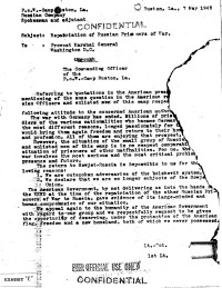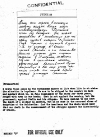 Suicide note found in barracks rubble following the Russian POWs riot at Fort Dix, June 29, 1945. U.S. Dept. of the Army Inspector General's Report. U.S. National Archives. Click to enlarge (152K) |